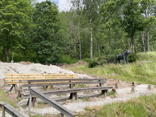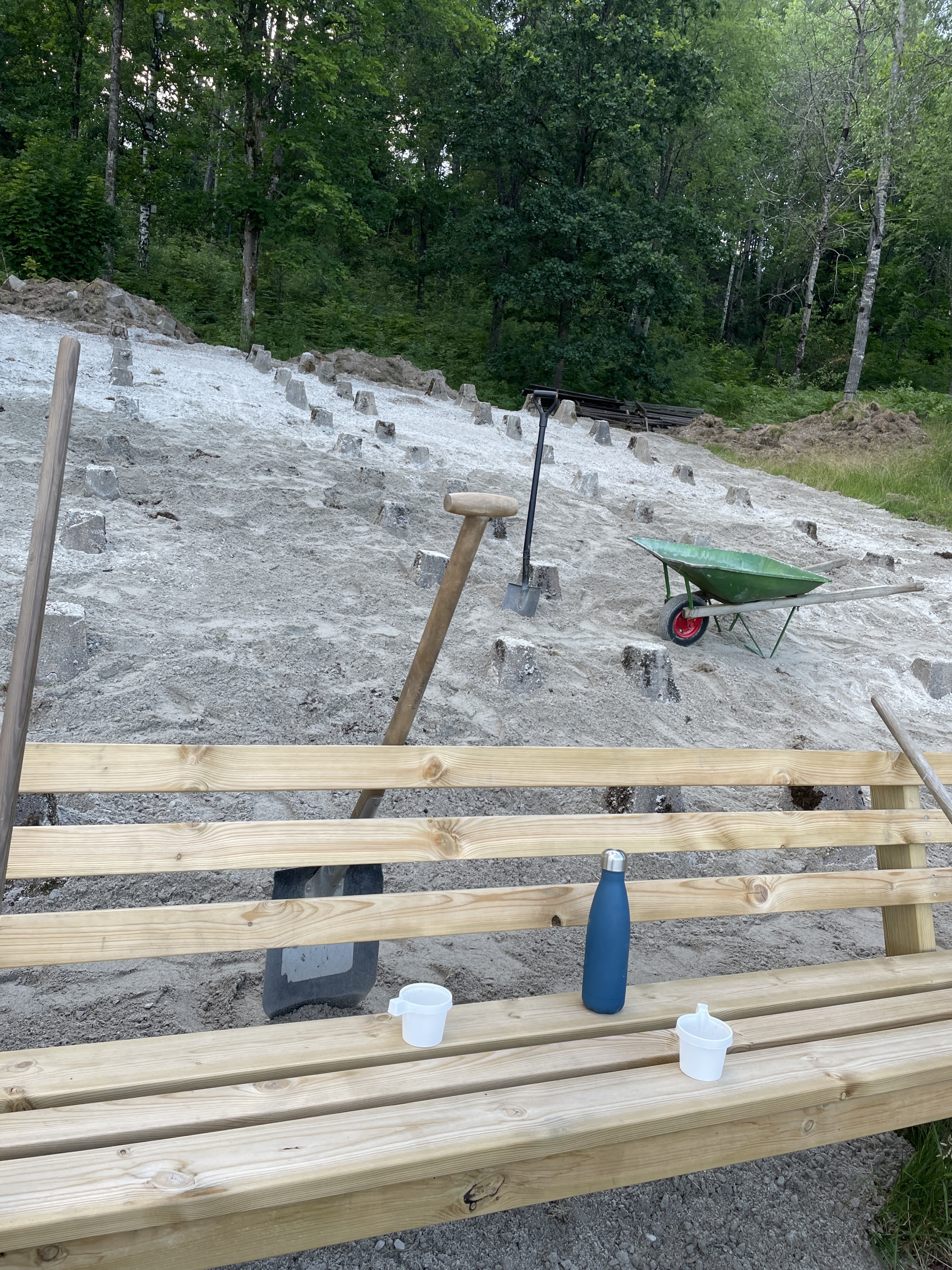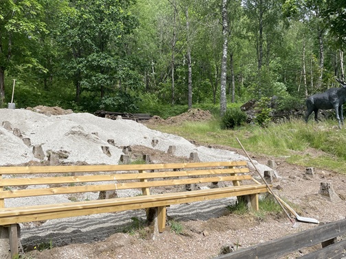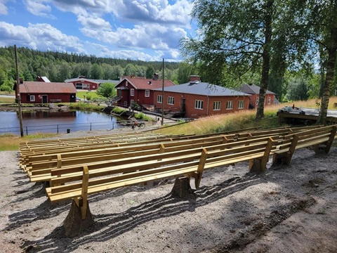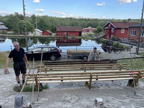 Under 2024 togs de gamla bänkarna bort. Vi hade fått en check från Leader som gjorde att vi kunde starta upp detta projekt. Bänkarna var dåliga, men konstruktionen av dem var genial. Mekargänget på Gåröströms Museum hjälpte oss att bygga dem med edt nya virket. Medlemmar i Teaterandan grävde och bar i sitt anletes svett med nya visioner i sikte.